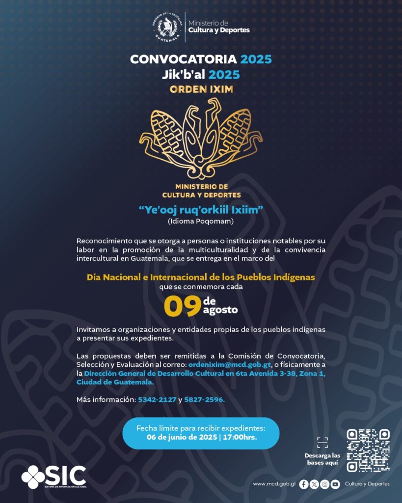 El Ministerio de Cultura y Deportes a través de la Direccion General de Desarrollo Cultural, de conformidad con el Acuerdo Ministerial número 764-2012, que responde a la Conmemoración del Día Nacional e Internacional de los Pueblos Indígenas, concede el reconocimiento de la Orden Ixim, a personas individuales o jurídicas, nacionales o extranjeras, que por su labor voluntaria que se destaquen en la contribución a la multiculturalidad y la convivencia intercultural en Guatemala.